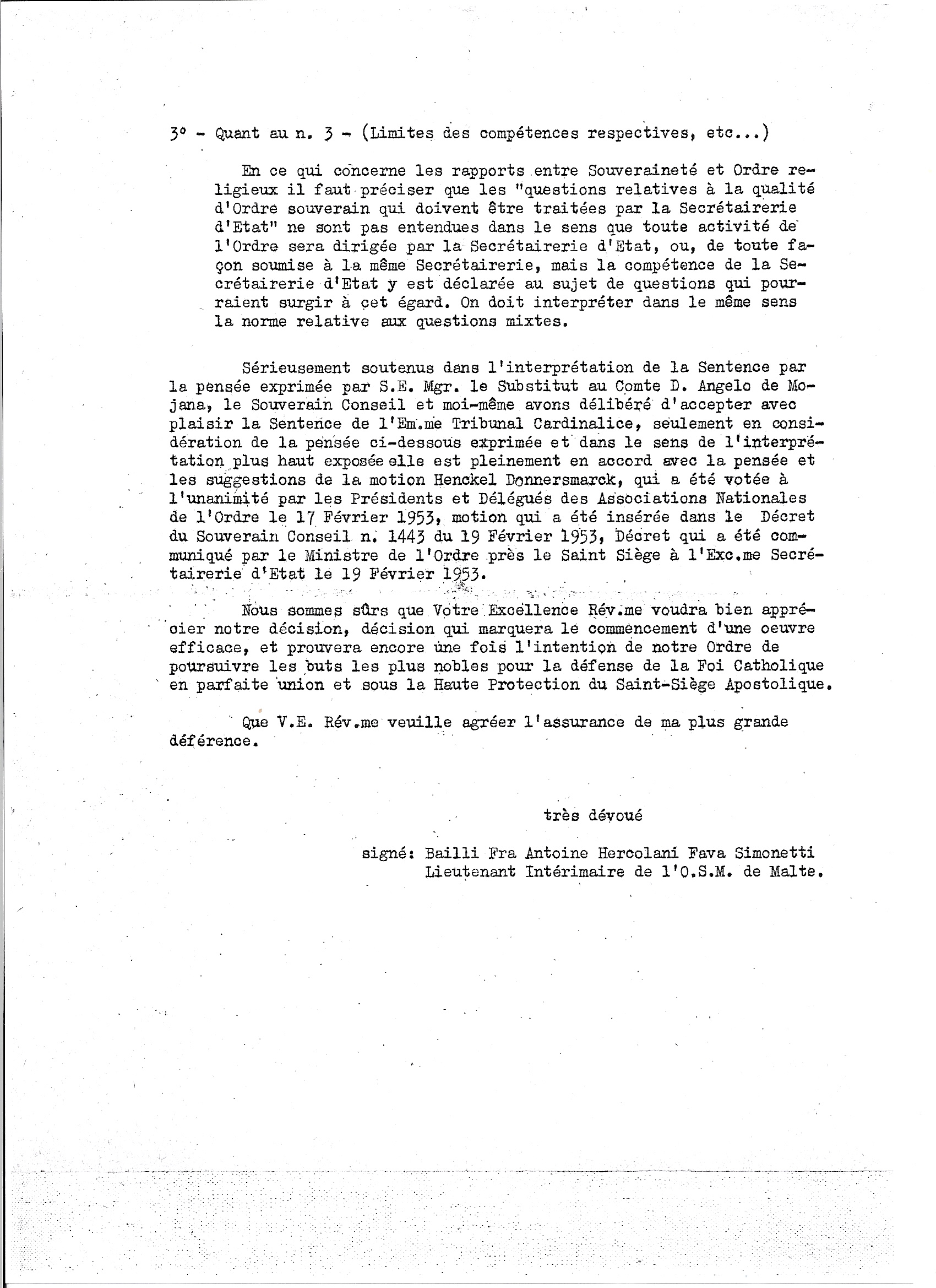En contra de lo que dice la Sentencia TSSA sobre que ninguna nota diplomática habida entre la Santa Sede y la Orden, puso en discusión la Sentencia Cardenalicia (punto 12), hemos de manifestar que sí la hubo por parte de la Orden de Malta. Después de recibir la comunicación de la Sentencia Cardenalicia, el 19 de febrero de 1953, la Orden se mantuvo en completo silencio, impotente ante la Sentencia ordenada por el Pontífice contra la que no cabía apelación ni recurso (c. 333 § 3). El Secretario de Estado del Vaticano, mediante carta de 7 de marzo 1953, N. 293.144, tuvo que requerir a la Orden para que manifestara su aceptación a la Sentencia. Cinco días después, el 12 de marzo de 1953, mediante carta de Réf. RIS. 2/142, el Lugarteniente de la Orden, Frà Antonio Hercolani, siguiendo un mandato del Soberano Consejo, contestó al requerimiento del Secretario de Estado (Doc. nº 2). En esta carta Hercolani, en nombre de la Orden, hacía una interpretación de la Sentencia Cardenalicia de acuerdo con sus propios intereses, afirmando entender e interpretar que la soberanía funcional consistía en el disfrute de prerrogativas inherentes a la propia Orden, como sujeto de derecho internacional; que el carácter religioso señalado por la Sentencia se refería solo a los profesos y a los capellanes, y que la dependencia de la Secretaría de Estado era solo para algunos asuntos y no para todos. Forzado por la carta previa del Secretario de Estado, hacía constar la aceptación de la Sentencia, pero condicionada a su propia interpretación. Naturalmente esta interpretación no se ajustaba a los términos inequívocos del texto cardenalicio, y la Secretaría de Estado se limitó a dar acuse de recibo a la respuesta de la Orden sin entrar en polémicas innecesarias. Como bien dice la Sentencia TSSA, la Orden no podía anular la Sentencia Cardenalicia por su propia iniciativa, por cuanto se trataba de un acto de la Santa Sede. Ni tampoco interpretarla, añadimos nosotros, por impedirlo el Quirógrafo papal del que traía causa. Por lo tanto, las matizaciones contenidas en la carta del Lugarteniente Hercolani, sólo significaron una manifestación de parte tras la cosa juzgada y, por tanto, carecieron de todo valor. Ello no obstante, la Orden decidió, una vez más a su conveniencia, que el silencio de la Secretaría de Estado significaba una aceptación de los términos contenidos en su carta. De esa manifestación unilateral de la Orden, y esto es de suma importancia, nace el error de excluir a los caballeros no profesos de la jurisdicción de la Santa Sede. Cincuenta y ocho años, después, la Sentencia TSSA de 5 de febrero ha venido a satisfacer aquellas ilegales interpretaciones de la Orden que desvirtuaban a su favor la letra y el espíritu de la Sentencia Cardenalicia de 1953.