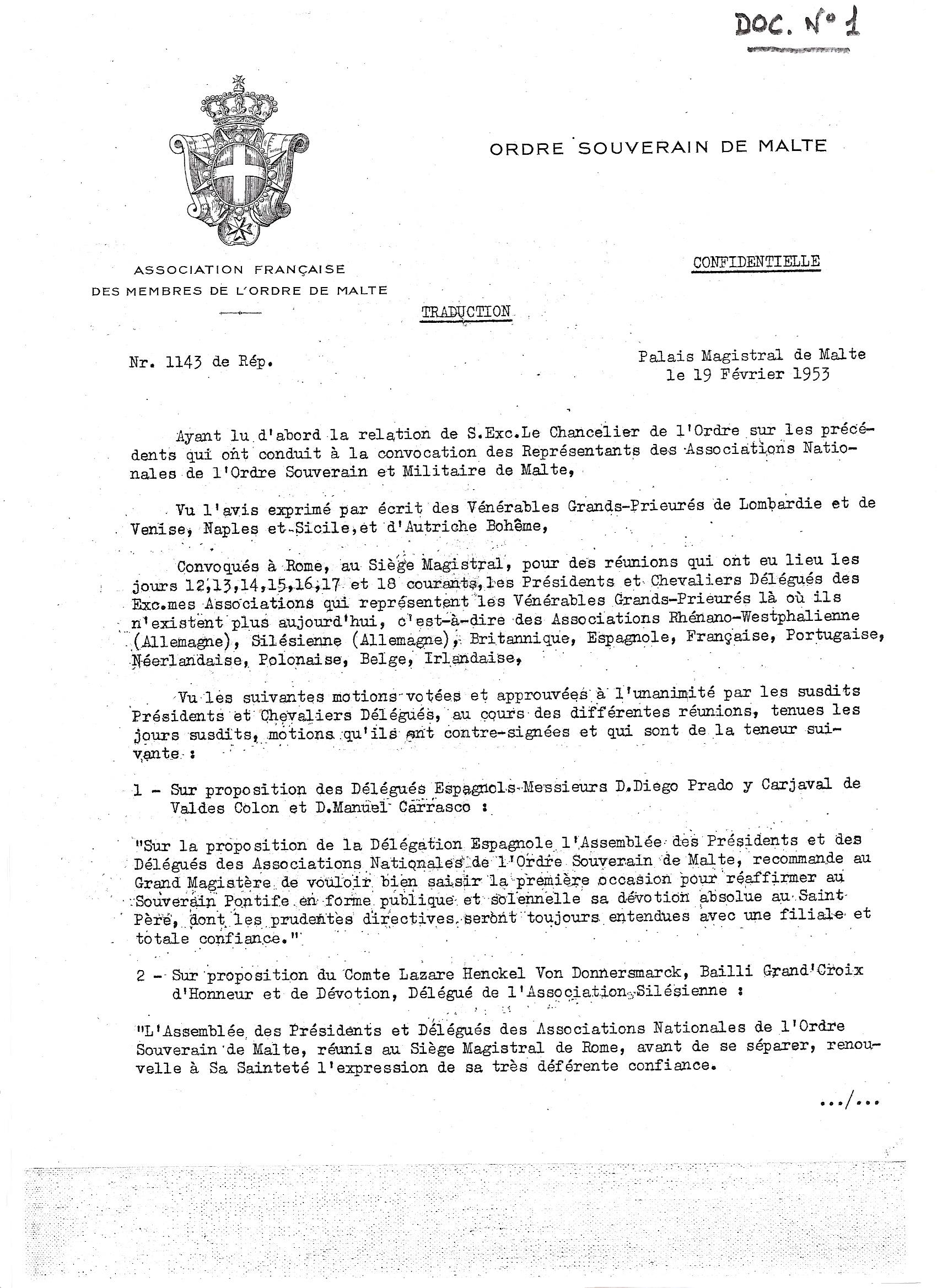 A la vista de los nuevos documentos que ahora hemos encontrado y que aportamos, es materialmente imposible que el documento probatorio citado en el punto 14 de la Sentencia TSSA, confirme lo expresado en la Sentencia Cardenalicia, como en la propia Sentencia TSSA se dice. Hay que aclarar, cosa que no hace la Sentencia TSSA, que el documento que cita es una nota de la Orden, de fecha 19 de febrero de 1953, dirigida a la Secretaría de Estado, mediante la cual se comunicaba el Decreto del Soberano Consejo de la Orden nº 1443, de 19 de febrero de 1953 (vid. Docs. nº 1 y 2). Este Decreto recogía alguna propuesta efectuada por los Grandes Priores y Presidentes de Asociaciones convocados en Roma durante los días 11 a 18 de febrero de 1953, con motivo del conflicto existente con la Santa Sede. En concreto, incluía una propuesta del Conde Lazare Henckel Von Donnersmarck, Delegado de la Asociación de Silesia, efectuada el día 17 de febrero de 1953 (vid esta fecha en Doc. nº 2). Transcribimos textualmente dicha propuesta (vid. Doc. nº 1):