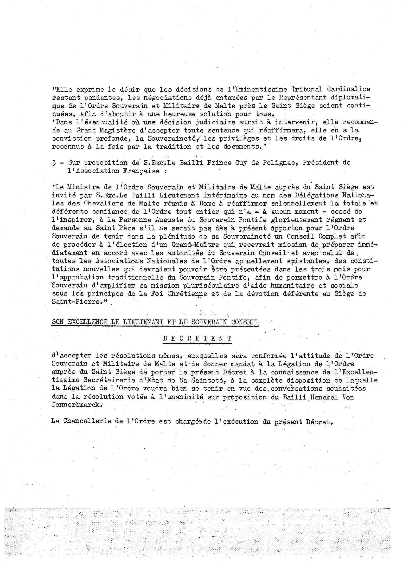 [...] Elle exprime le désir que les décisions de l'Eminentissime Tribunal Cardenalice restant pendantes, les négotiations déjà entamées par le Répresentant diplomatique de l'Ordre Souverain y Militaire de Malte près le Saint Siège soient continueés, afin d'aboutir à une heureuse solutions pour tous.